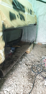 Betty is finally home. Lot more cutting and polishing up of layers. Also quite a few overspray on rear and around the rest of the bus.