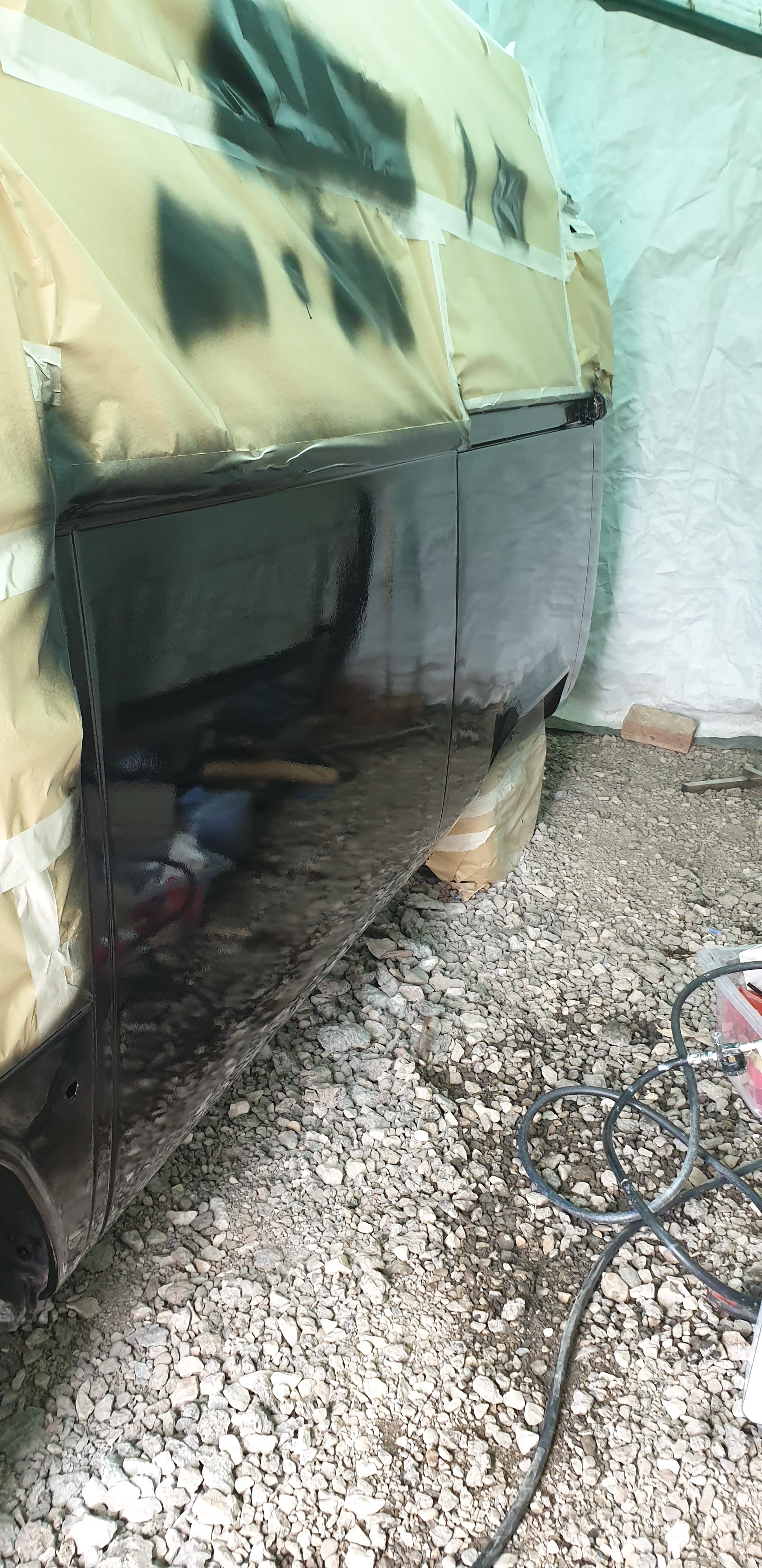So as the Barn has no facilities for an internal spray booth I had to construct one outside at the rear. Luckily the guys at Bug Barn had a temp garage tent (Thanks Nige)